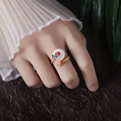 Chinese style auspicious cloud ring female minority design retro style enamel color painting Hotan Jade open end ring fashion personality feng shui