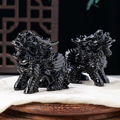 A Pair of Natural Obsidian Kirin Decorations - Feng Shui for Home Protection and Evil-Warding, Fortune-Attracting and Blessing-Gathering in Living Room and Entryway (High-End Decoration)