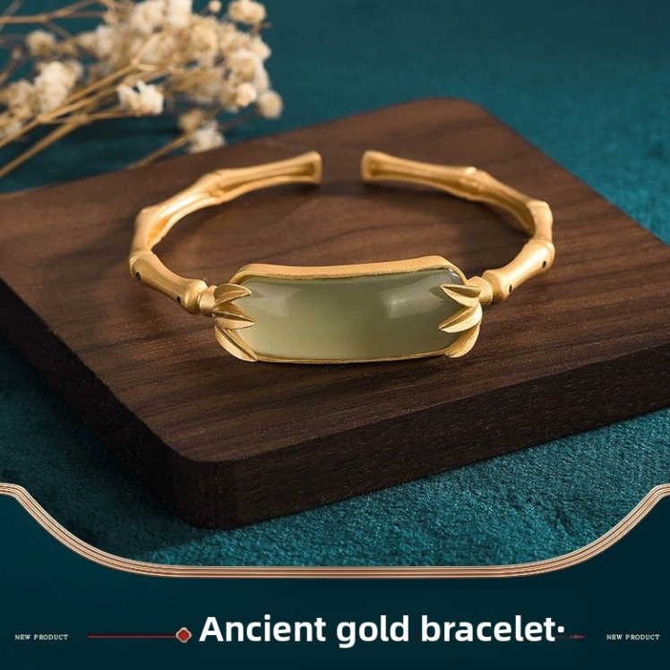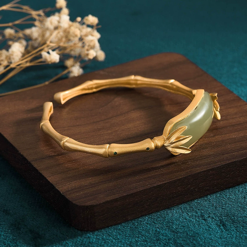 Eryuan China-Chic style gold plated inlaid imitation Hotan Jade bamboo leaf green festival high bracelet for women simple bracelet