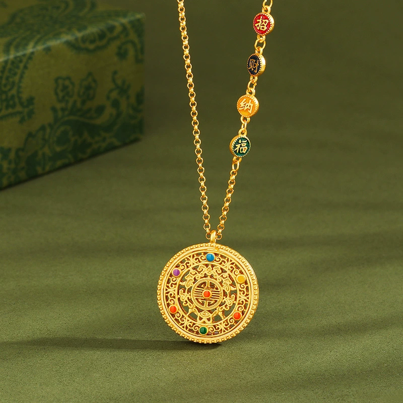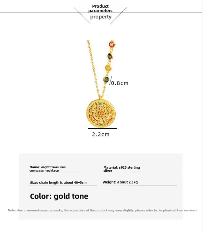 Pure silver Eight Treasures Compass Pendant for Ladies, Middle French Gold Flower Silk Feng Shui Wishful Perfection Enamel Auspicious Eight Treasures Necklace