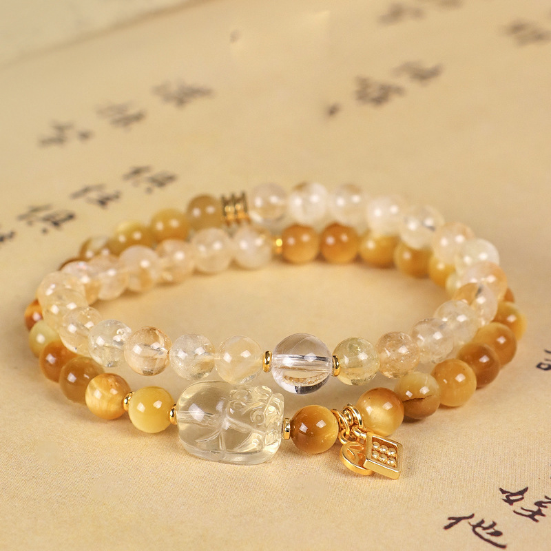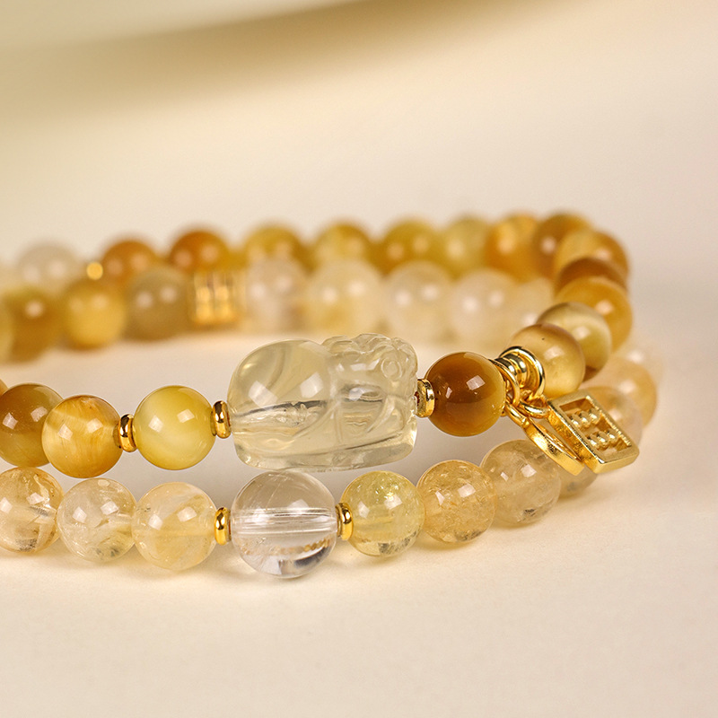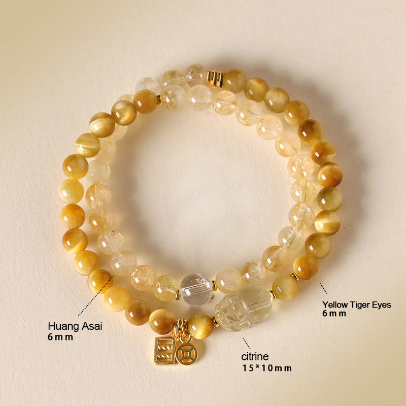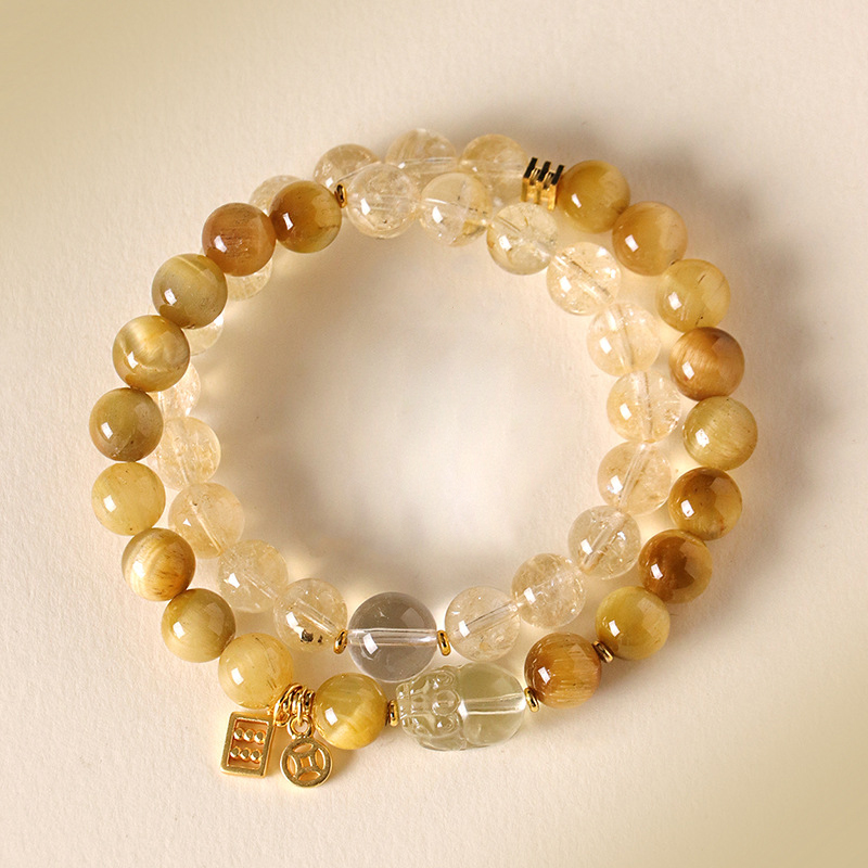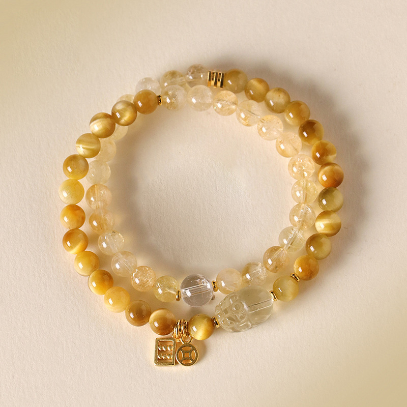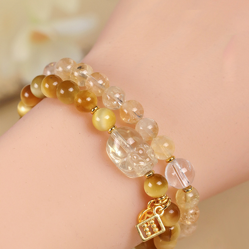 Yellow Tiger Eyes, Yellow Ace Double Circle Beaded Bracelet, Female Niche, High End, Yellow Crystal Pixiu Bracelet, Feng Shui, Fortune Attraction