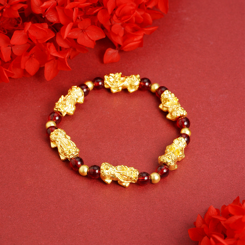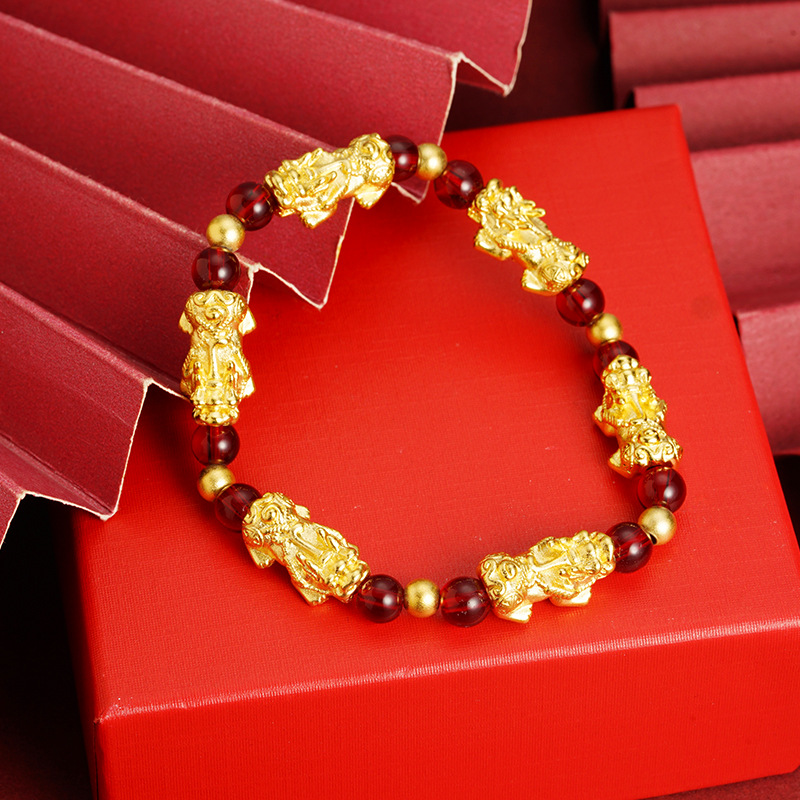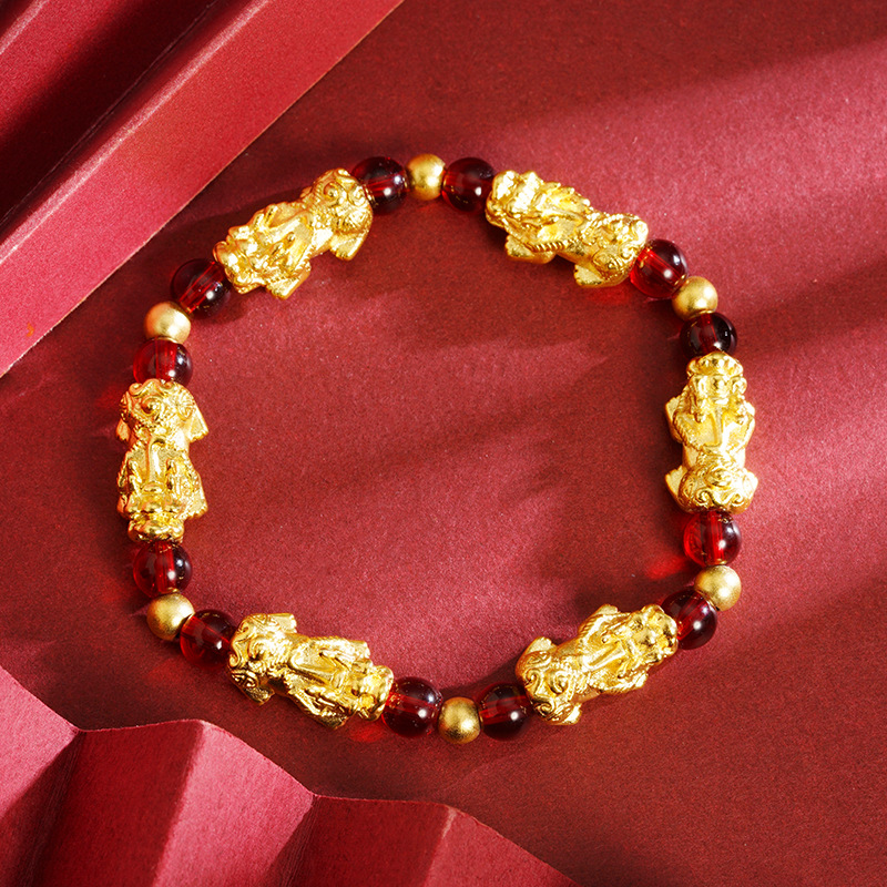 The bracelet features a finely crafted gold-plated Pixiu charm. Each charm is polished to highlight its intricate detailing, symbolizing strength, prosperity, and auspicious energy.