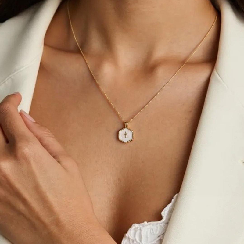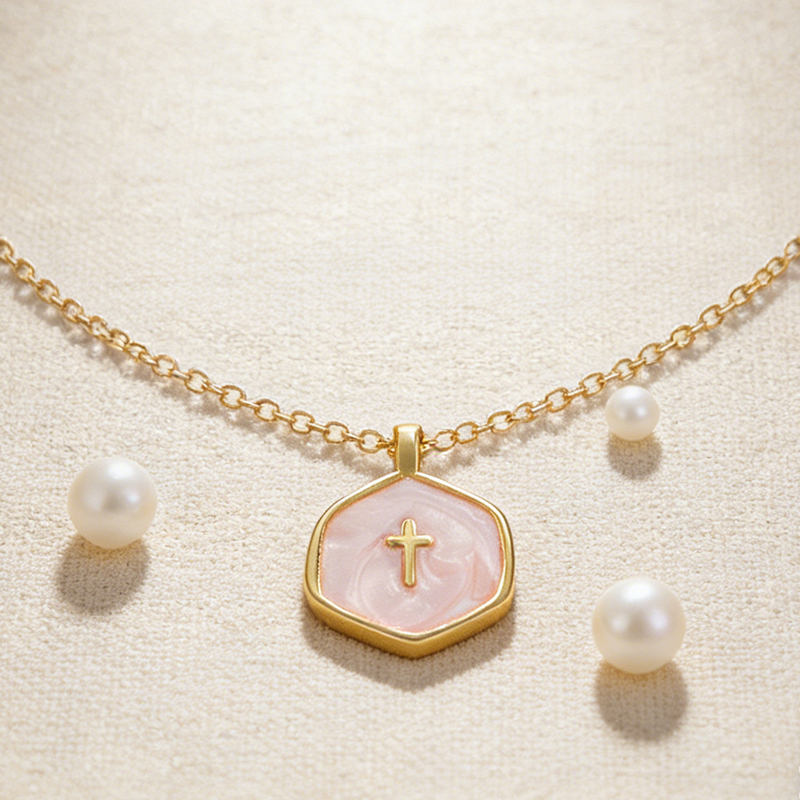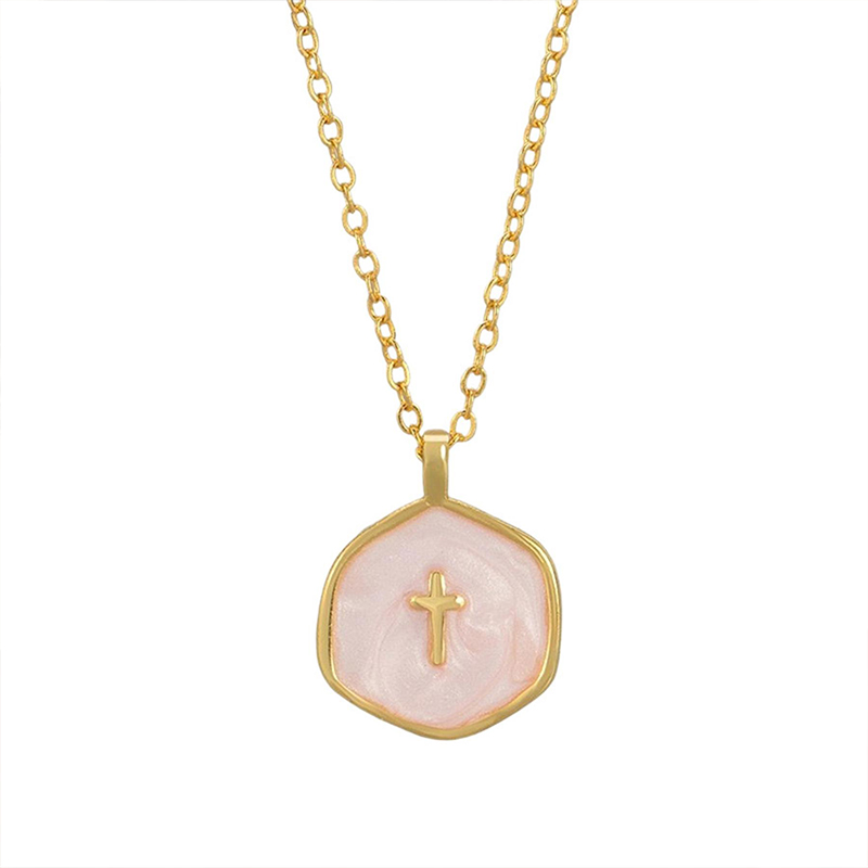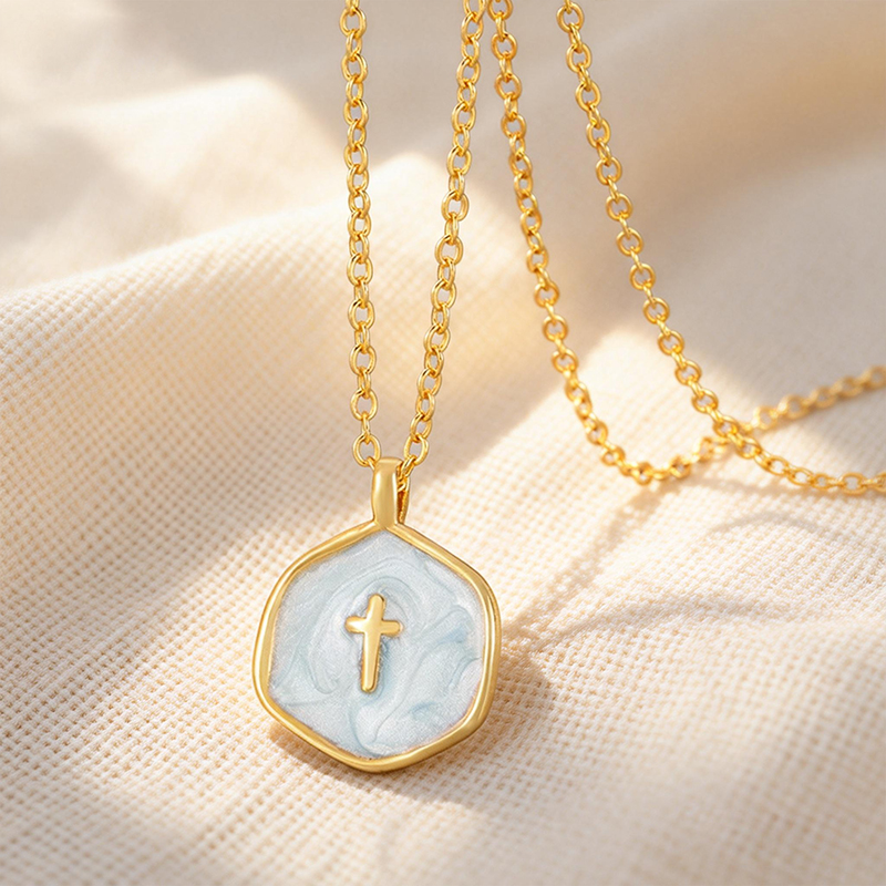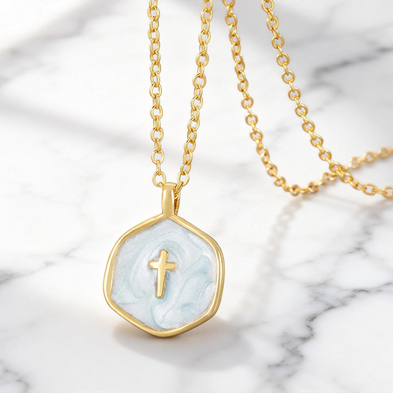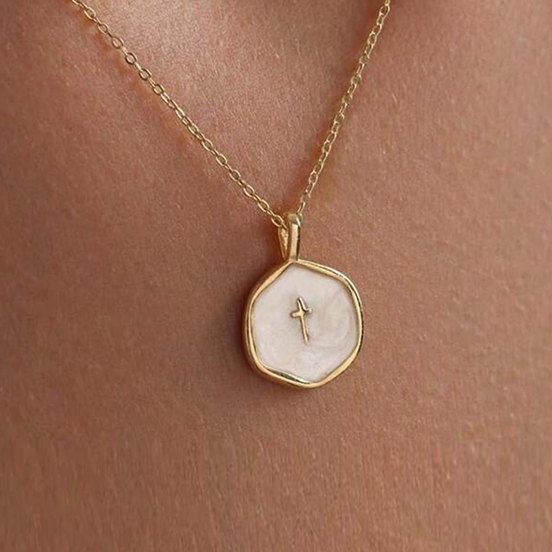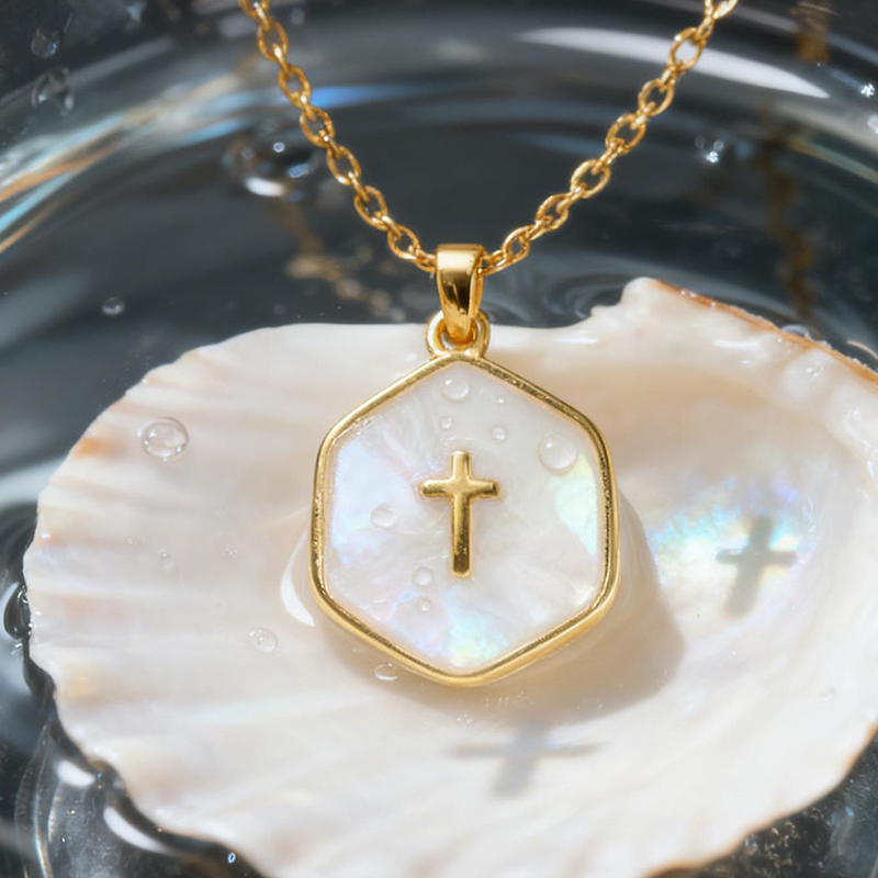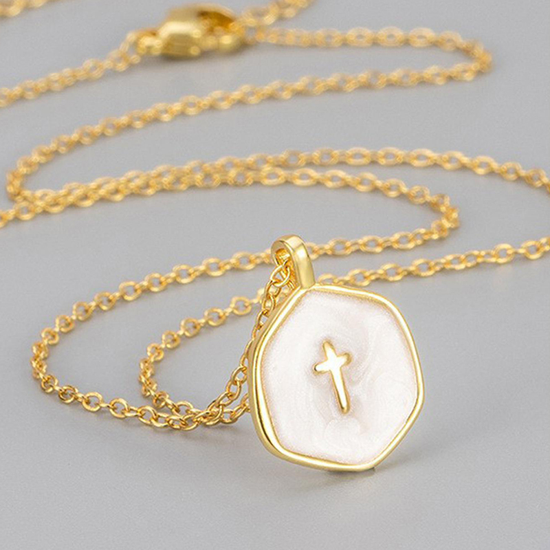 This elegant gold-tone cross necklace features a unique irregular pendant design with a soft, pearly finish.
